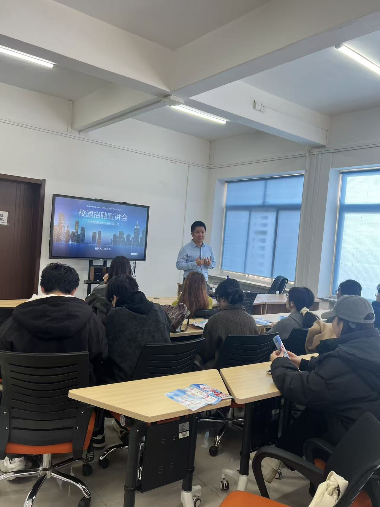 招聘会现场,jnh今年会网站院长马春宇对学院的专业情况向两家企业进行了简单介绍,希望通过进一步加强校企合作、对接用人市场需求,为毕业生拓展就业渠道,为企业提供优秀的人才。