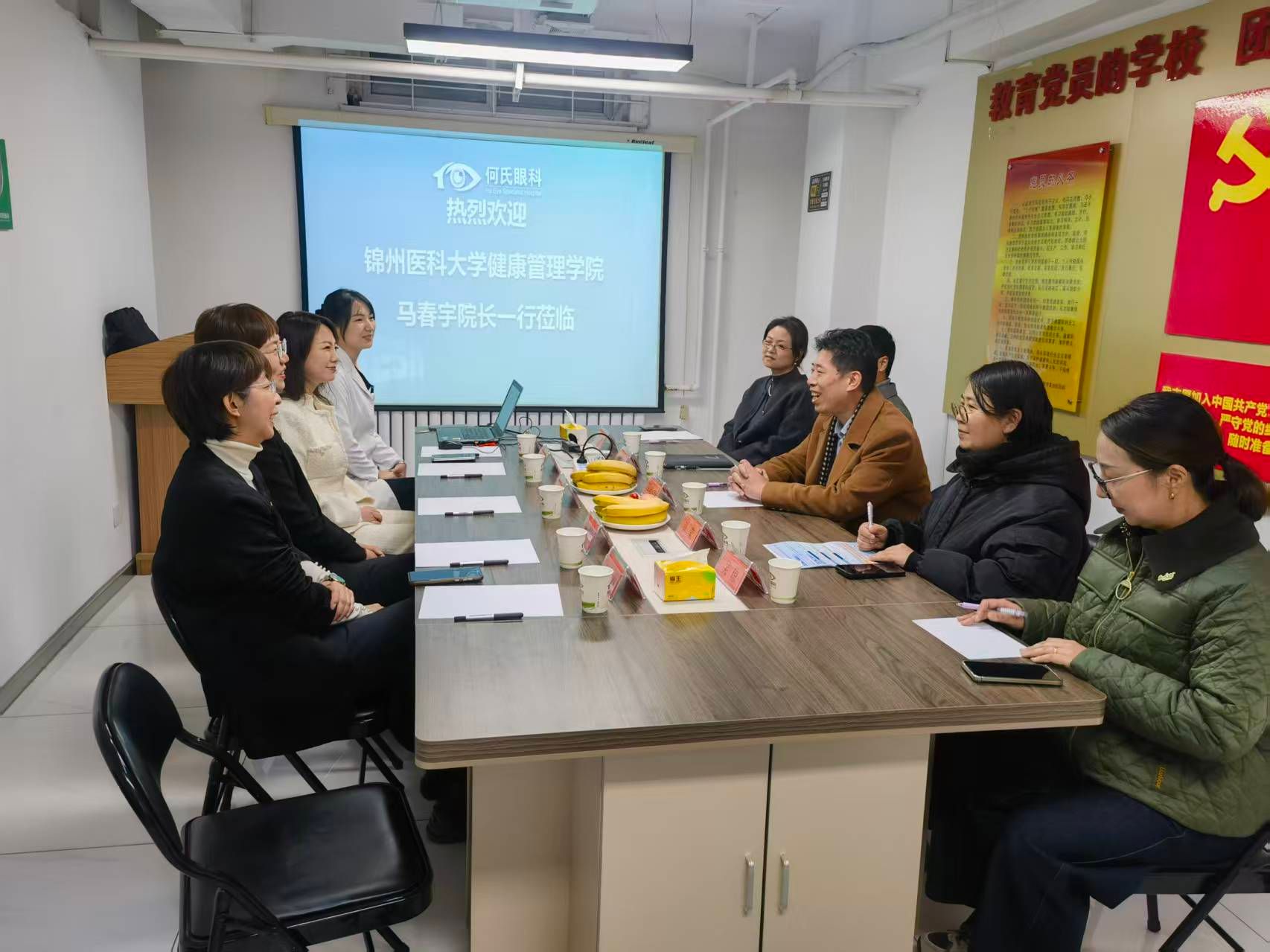 为深化产教融合协同育人机制,拓展学生实习实践与就业平台,进一步加强学院与健康医疗行业的紧密对接,11月18日,健康管理现代产业学院马春宇院长率学院领导班子及教师代表一行,前往锦州何氏眼科医院开展“访企拓岗促就业”专项调研活动。学院党委副书记郑贺、副院长褚志亮、学生办公室主任张莹、教学秘书吴琼陪同参与。
