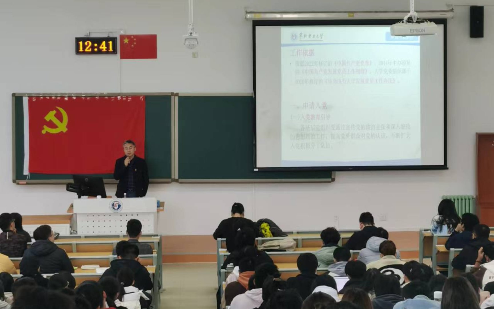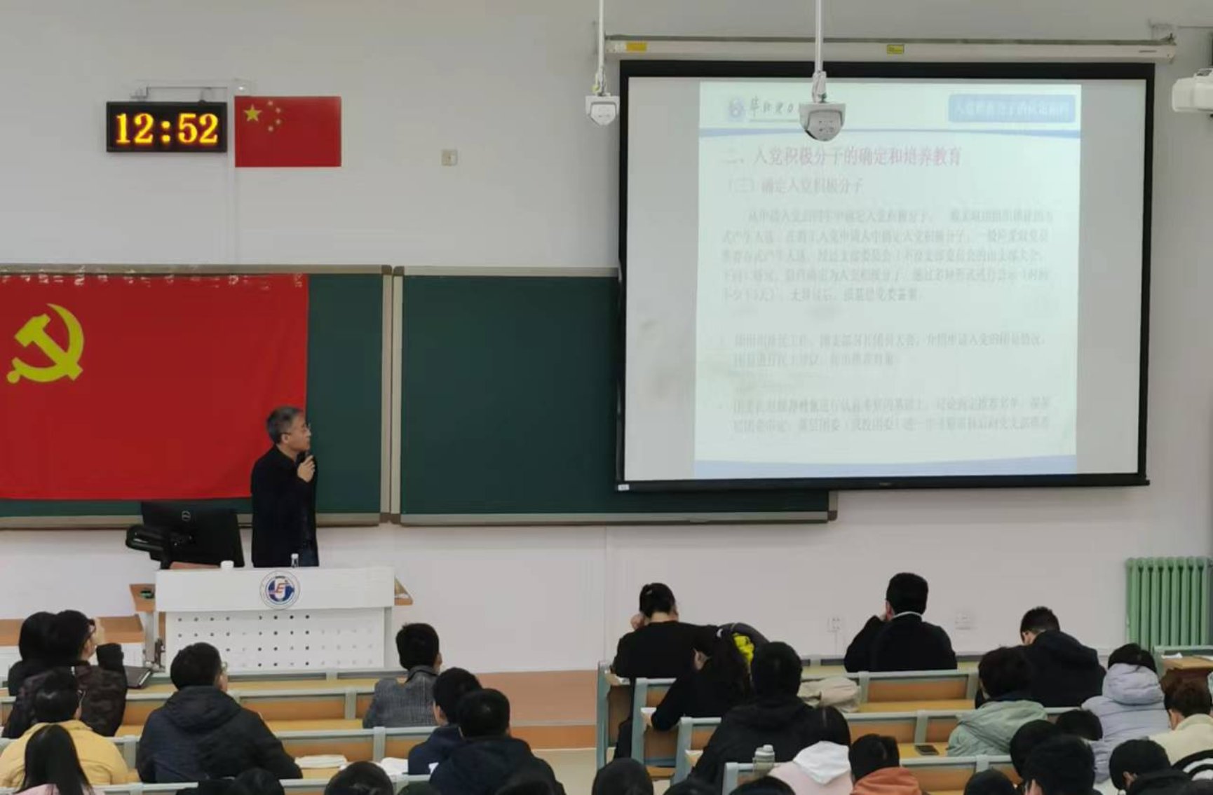 张宝良首先向同学们介绍了学校党员发展工作的依据《中国共产党章程》、《中国共产党发展党员工作细则》和《新浦金350vip官方发展党员工作办法》。随后他阐述了申请入党需要满足的五个条件以及发展党员的规定和程序。为积极分子学员总结梳理入党需要的四个阶段,详细讲解发展党员每个阶段的流程和要求,和如何撰写入党申请书等材料的格式和要求。