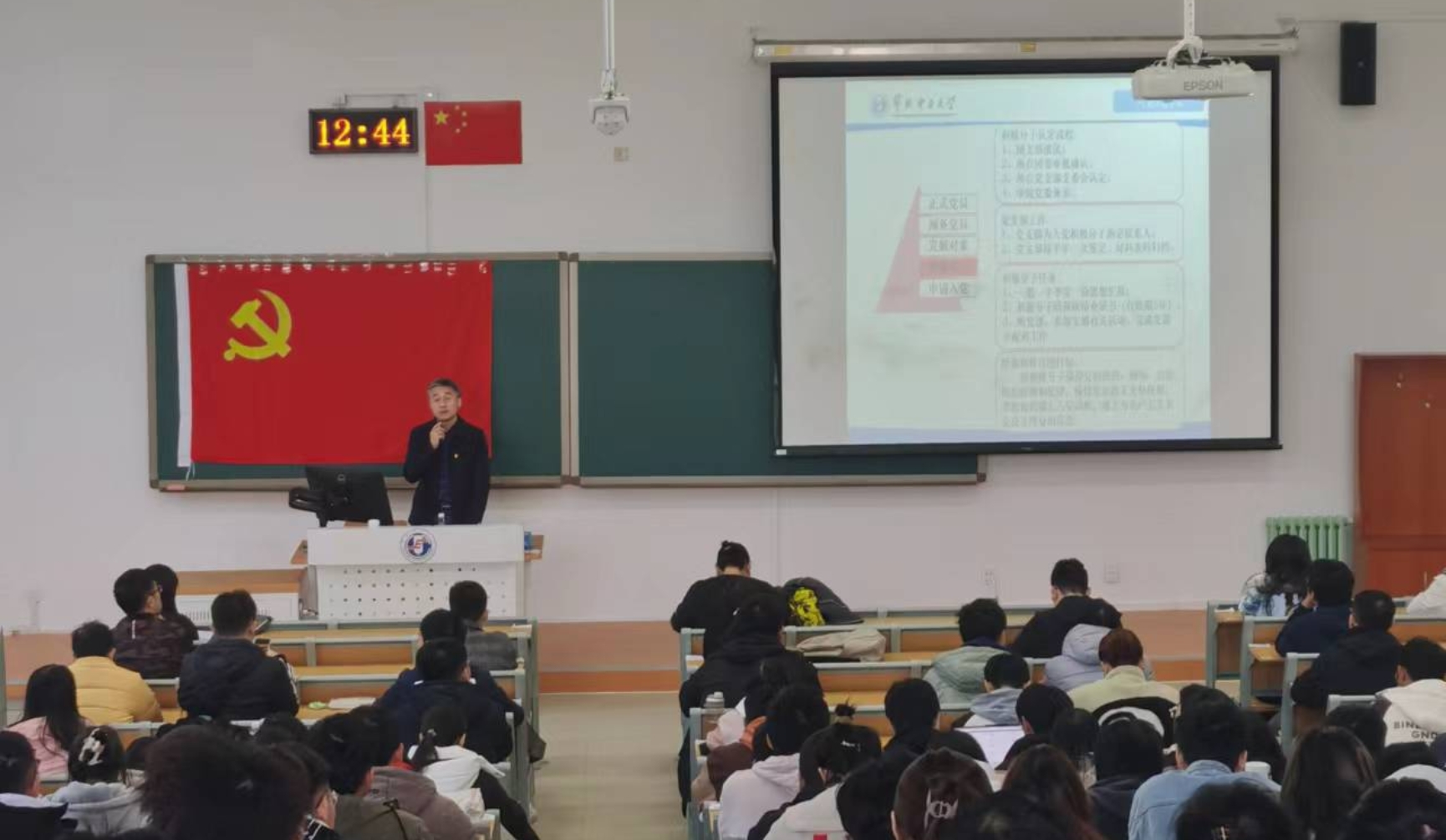 2023年11月8日中午,新浦金350vip官方第56期入党积极分子培训班第三次党课在主B201举行。学院正处级组织员张宝良以“入党的规定和程序”为题,从“入党程序及要求、思想入党和组织入党、以实际行动向党组织靠拢”三方面来讲授党课,辅导员王倩参加了本次党课培训。