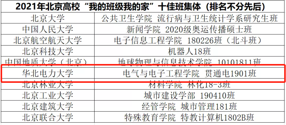 为深入推进高校优秀学生基层建设, 2021年12月29日,北京高校“我的班级我的家”十佳班集体创建评选会在北京工业大学顺利召开,经过学院推荐、学校推荐和专家现场评审,我院贯通电1901班从49所北京高校的236个参评班级中脱颖而出,获北京高校“十佳班集体”荣誉称号。