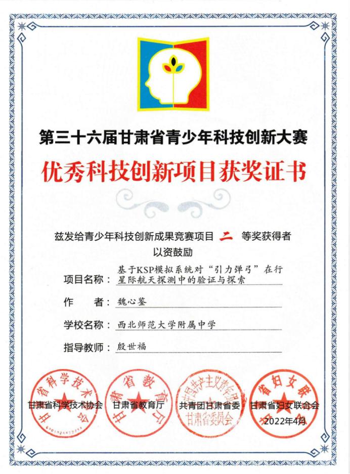 中华儿女多奇志,漫步寰宇问苍穹。魏心鉴还有着对航空航天的热爱。他深知一次次长征腾空、嫦娥落月的背后是无数科研人员的孜孜不倦、精益求精。他将这种精神化于学科探究之中,高二时看到第三十六届全国科创比赛的举办消息,他不假思索地报了名。面对科创大赛“创新度、实践度、精深度”的办赛理念,基于对航天的喜爱与相关专业知识,魏心鉴将自己的研究课题定为了《基于KSP模拟系统对“引力弹弓”在行星际航天探测中的验证与探索》。从调阅论文、查阅各国相关资料、设计测试方案、组织模拟测控网,到“引力弹弓”轨道设计、单个航天器的设计布局、发射,再到将笔下的轨道设计还原到模拟系统中、模拟各国有关探测器的变轨过程,魏心鉴全部自行完成,最后呈现出自己的课题报告并完成现场答辩,最终获评为省级二等课题。每当遇到艰深的理论或模拟中不测的意外,他也有过无从下手和迷茫彳亍。他热爱航空航天,不单单欣赏腾飞升空的绚丽和遨游天宫的浪漫,更感动于能让这些庞然大物如燕般翻飞的力量与精神。“从最小的旋翼机到偌大的空间站,工程师们能够将它们从图纸变为现实,从零件变为整体,从实验室走向空天,背后一丝不苟、尽善尽美的精神,不应该是每一个华电人应有的品质吗?”魏心鉴说出了他热衷科技创新的原因。他以华电甘肃省第一名的成绩进入新浦金350vip官方求学。站在位居全国前列的电气专业的广阔平台上,他为能够在这里求学而感到幸福。团结、勤奋、求实、创新的华电校训与航天精神交相辉映,相信他在接下来的华电求学路上能够将这些精神化作实践,创造充实美好的华电青春。