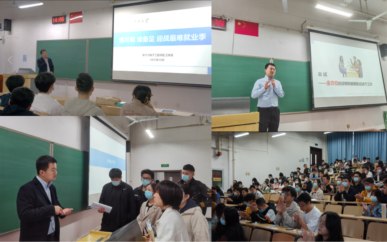 讲座过程中,通过展示国家宏观经济数据、近三年电气学院就业数据,王栋梁和同学们分析了就业趋势、就业岗位变化情况、高校就业人数变化、就业市场饱和度等情况,希望同学们能综合社会需求和个人实际情况,合理调整预期、主动出击,同时通过学校就业指导中心网站、企业招聘官网、身边的老师、朋友等渠道获取就业信息,尽快聚焦目标单位范围,为求职准备立好靶位。